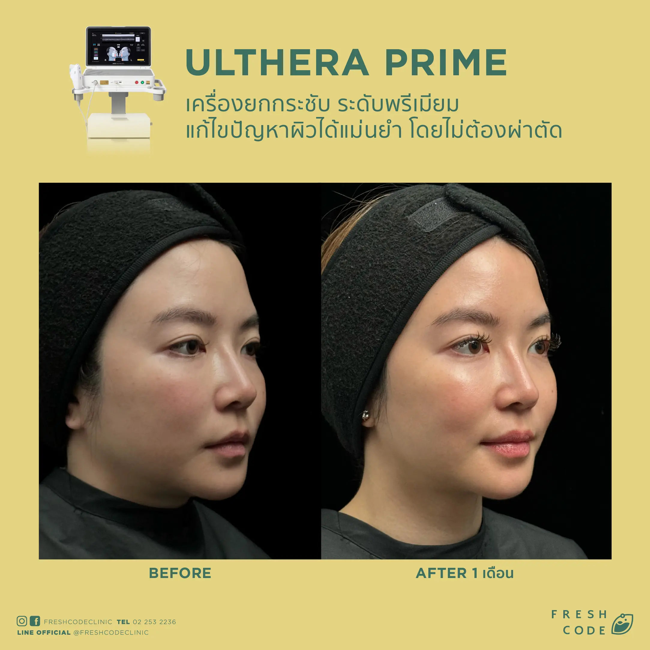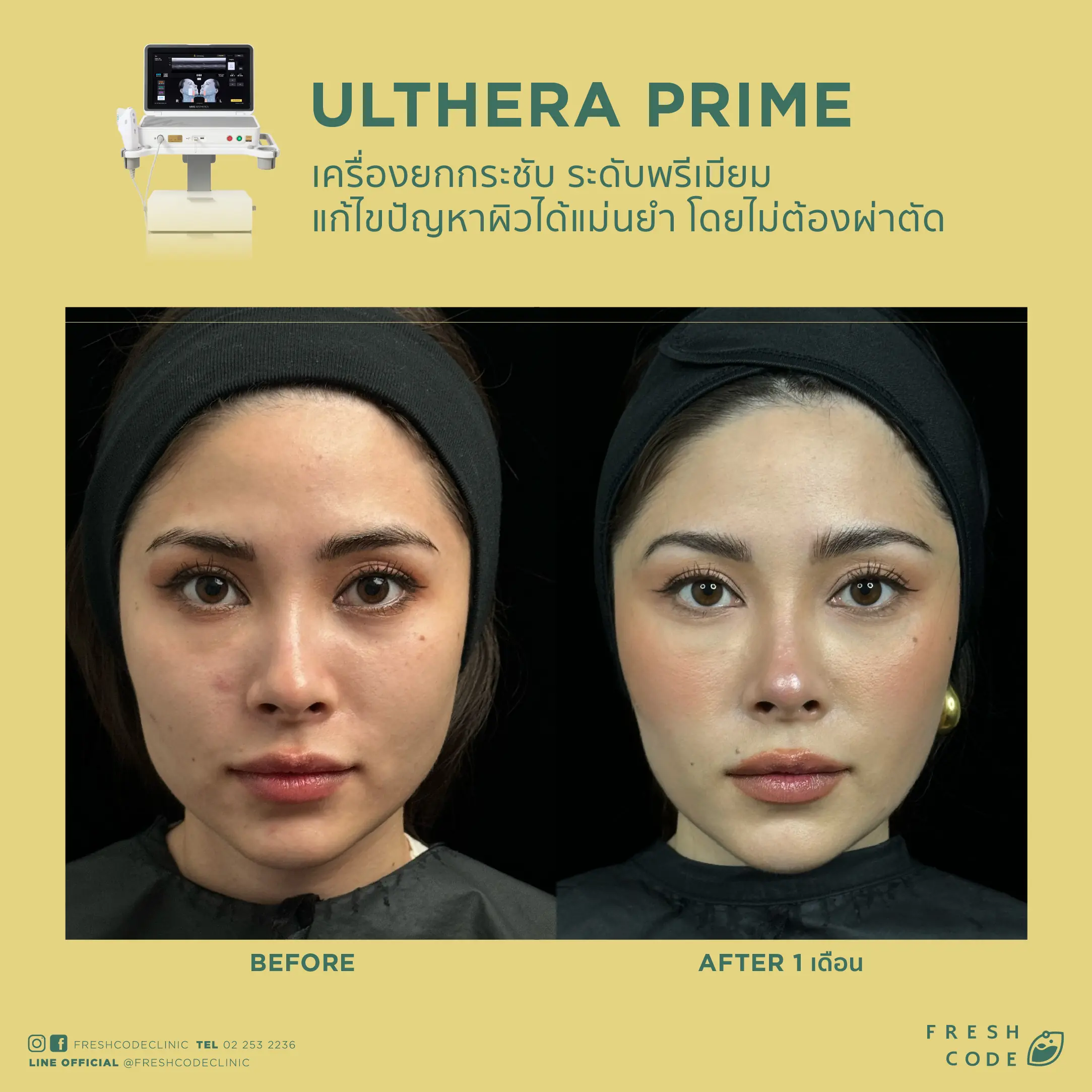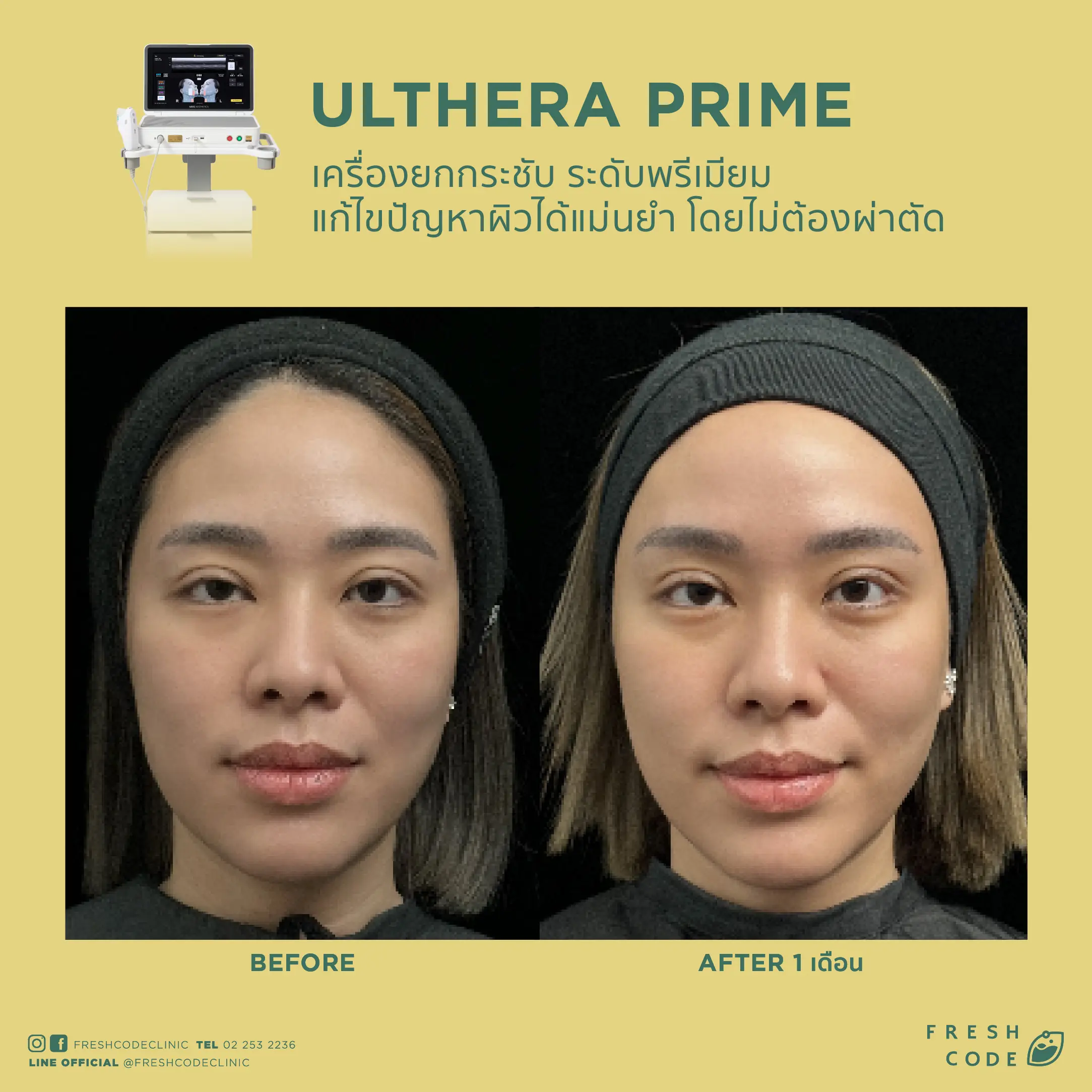 Ultherapy Prime before and after review: Results of face and eyebrow lifting using Microfocused Ultrasound technology at Fresh Code Clinic.
